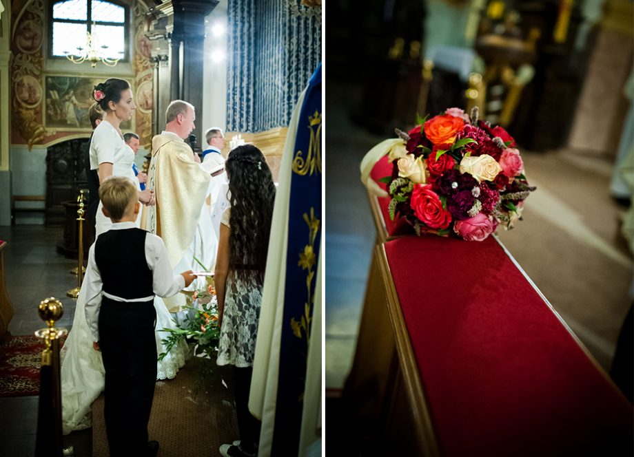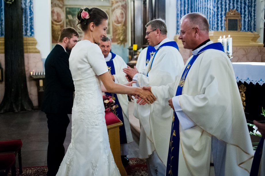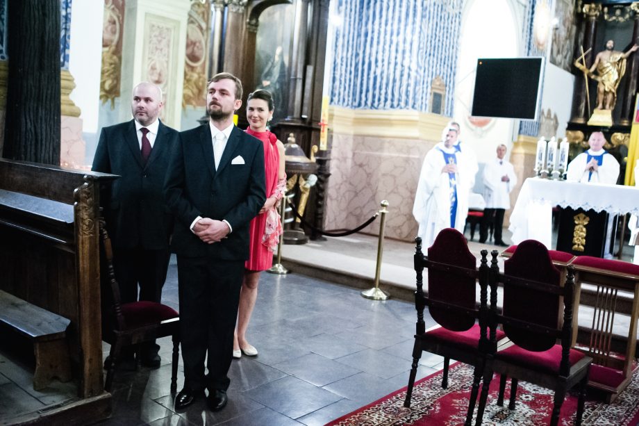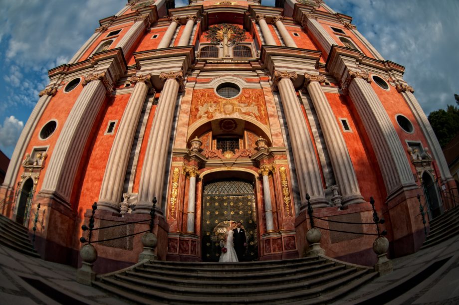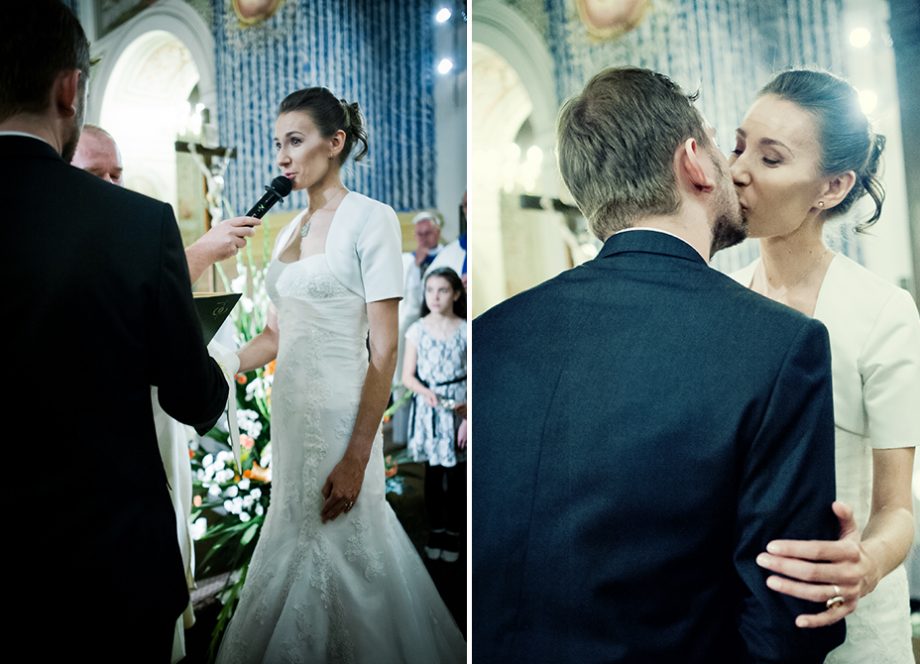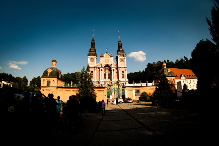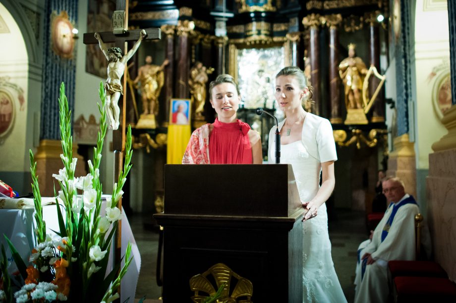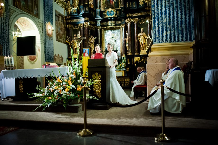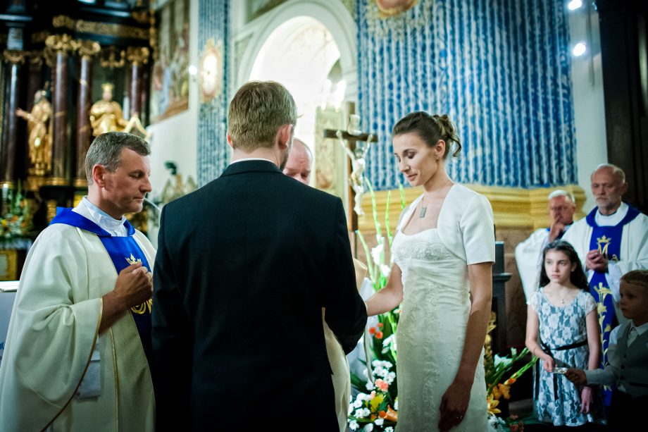 Ślub odbył się w Sanktuarium Maryjnym w Świętej Lipce na Mazurach. Piękne miejsce. Tuż przed ślubem udało się zrobić półgodzinną sesję w krużgankach świątyni. Ponieważ Kasia i Marek są muzykami nie zabrakło pięknych śpiewów i wyjątkowej oprawy muzycznej w trakcie ceremonii. Psalm był śpiewany przez samą pannę młodą i jej świadkową. Cudnie.
